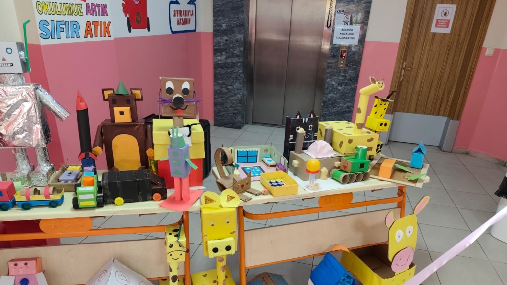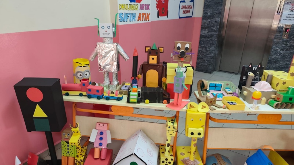 Öğrencilerimiz, evlerinden getirdikleri geri dönüştürülebilir atık malzemeleri kullanarak çeşitli geometrik cisimleri tasarladılar. Karton kutular, pet şişeler, pipetler, gazete kağıtları ve daha birçok atık malzeme; prizmalar, küpler, silindirler ve koniler gibi geometrik şekillere dönüştürüldü.